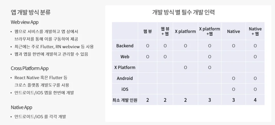개발팀의 가장 기본적인 구성은 백엔드 개발자 1명 + 프론트엔드 개발자 1명입니다. 하지만 우리 서비스에 필요한 프론트엔드가 웹 인지, 앱인지에 따라 필요한 인원은 크게 달라집니다.
